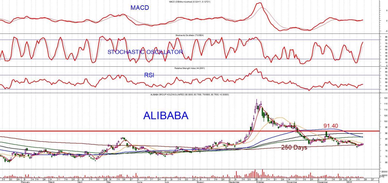 * 扬子江金融 (YZJ Fin) 收涨 1.9%,至 53 分。这只股在我们 2024年6月11日的技术图表分析中有再次被提及。近两年来,该股价大致上都在 40 分以下交易,而今年终于冒出头来,出现上升的趋向。 * 恒生指数周五飙升 3.69%, 或 805.96 点,科技股继续领涨。腾讯上涨 7.42%,至 474.80 港元。我们在 2025年2月6日早上9点讯息中提到的比亚迪再飙升 7.43%,至 364.20 港元。 * 阿里巴巴周五上涨 6.34%,至 124.10 港元。我们在 2025年1月20日的技术图表分析中有再次推荐阿里巴巴,当时其交易价为 85.38 港元;此后,其股价如烈马奔腾,从那时到目前为止,已飙升了超过 45% 。 所提供的本文只供参考, 投资买卖,必须審慎,自负责任。版权所有,未经允许,禁止转载。) ( All contents provided are for informational purposes only. Access to and the use of the contents are at the user's own risk. You should assess your situation and risk tolerance, and do your own due diligence before making any investment decisions. All losses and costs associated with investing are your responsibility. All rights reserved. This material may not be published, broadcast, or redistributed without permission. ) * Yangzijiang Finance (YZJ Fin) closed up 1.9% to 53 cents. This stock was mentioned again in our technical chart analysis on 11 June 2024. It had been largely trading below 40 cents for almost 2 years, and finally had an impressive run this year. * The Hang Seng Index surged 3.69% or 805.96 points as tech stocks continued to lead gains. Tencent jumped 7.42% to HK$ 474.80. BYD, which was mentioned in our 6 Feb 2025 9.00am update, soared another 7.43% to HK$364.20. * Alibaba rose 6.34% to HK$124.10. The technical chart analysis of Alibaba was done in our 20-Jan-2025 market update when its stock price was trading at HK$85.38; Alibaba's stock price had since galloped 45% to the current price like a raging stallion.
