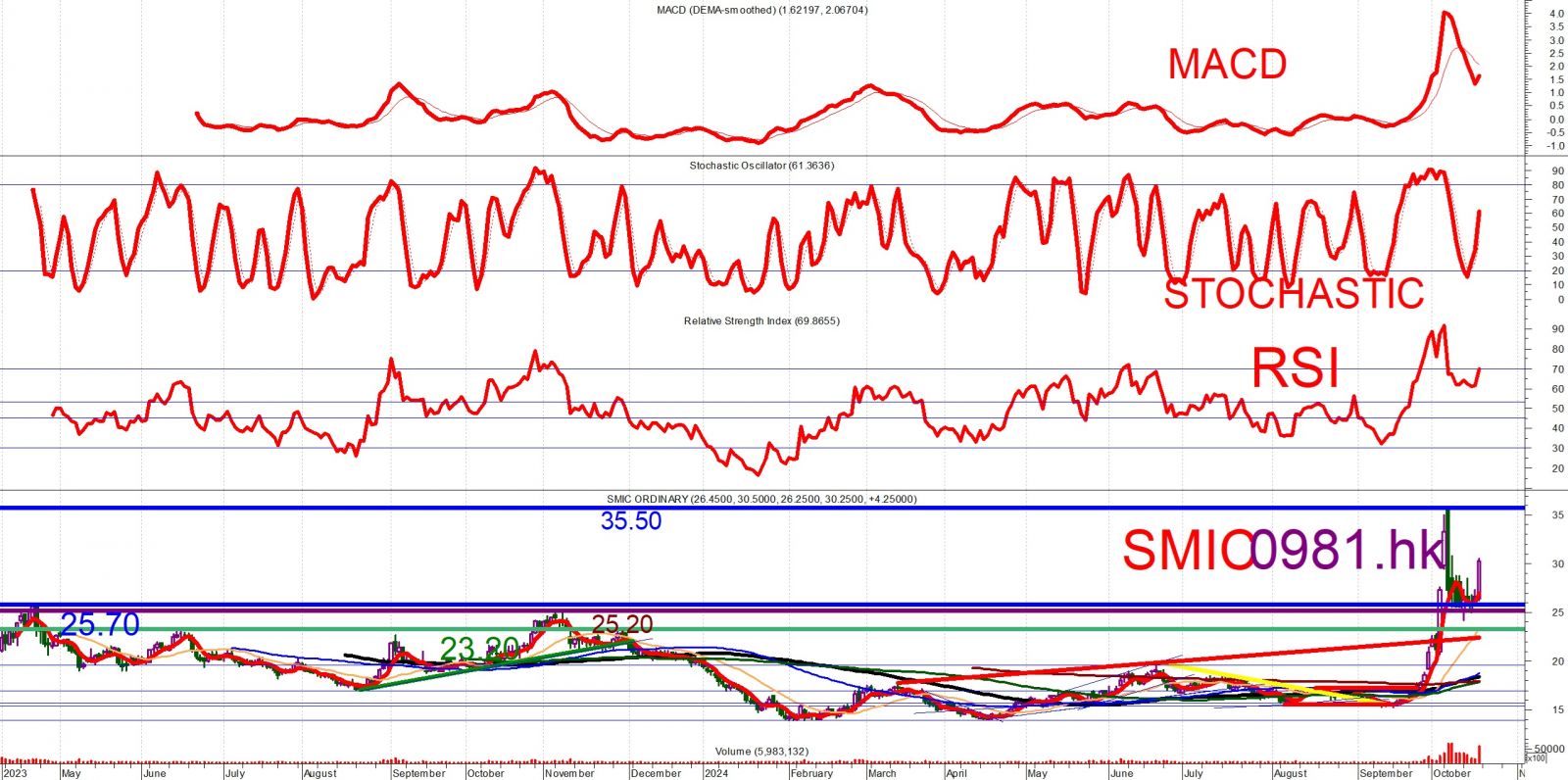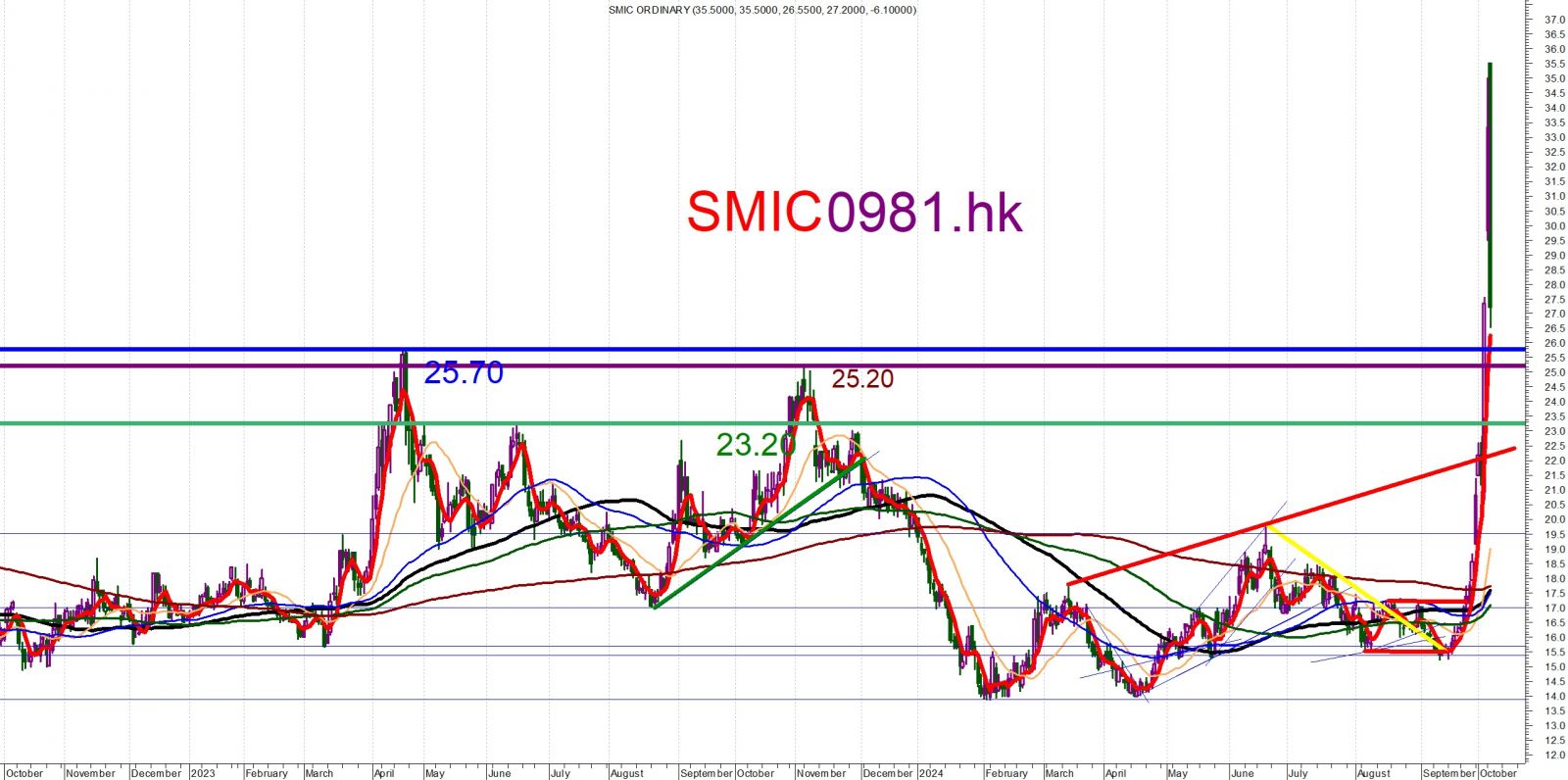 在惊人的涨势之后,分析师对中港股市今后的表现看法不一。一些认为这些股市上涨得过多过快,已经超买,应该会回调。其他人则表示,中港股市仍有继续上涨的空间。无论如何,值得注意的是,尽管近期中港股市强力反弹,许多中港的优质股票仍低于三年和五年平均水平,而随着中港股市这三年来的抛售,估值仍然还算是便宜的。 我们今年详细提到的两只值得长期投资的香港股票表现大好。所提过的这两只港股正是中芯国际 SMIC(请参阅Ecomm 2024 年 7 月 29 日、2024 年 5 月 13 日、2024 年 5 月 11 日、2023 年 9 月 25 日的 报导)和 腾讯 Tencent(请参阅Ecomm 2024 年 5 月 20 日 的报导)。 中芯国际(0981.HK)股价在 10 月 4 日 飙升 29.3%,有消息称北京方面宣布不鼓励中国人工智能公司购买美国英伟达(Nvidia)芯片,消息出来后推高了中国本土芯片制造公司的股价。中芯国际是一家由中国政府资助并部分拥有的中国芯片制造公司,该公司为华为供应芯片,其股价从 2024 年 9 月 23 日的 16.26 港元 暴涨 至 2024 年 10 月 4 日的 27.35 港元,涨幅高达 68%。我们在今年早些时候提到中芯国际是一只值得投资的股票时,交易价格仅为 16 多港元。 腾讯(0700.HK)今年积极实行股票回购(stock buybacks),股价近期也飙升。腾讯股价从 9 月 23 日 的 387.60 港元 跃升至 10 月 4 日 的 477.60 港元,涨幅为 23.2%。腾讯拥有 13 亿微信用户,所提供的许多产品也仍处于货币化的早期阶段。当 Ecomm Invest 提到腾讯是一项值得长期投资的公司时,其股价约为 380 港元。 (所提供的本文只供参考, 投资买卖,必须審慎,自负责任。版权所有,未经允许,禁止转载。) ( All contents provided are for informational purposes only. Access to and the use of the contents are at the user's own risk. You should assess your situation and risk tolerance, and do your own due diligence before making any investment decisions. All losses and costs associated with investing are your responsibility. All rights reserved. This material may not be published, broadcast, or redistributed without permission. ) There are mixed views among analysts out there as to how these markets will perform from here after the recent spectacular rallies. Some are saying these markets went up too much too soon, are overbought and are due for pullbacks. Others are saying that there are still room for the rally to continue on. In any case, it is good to note that despite the recent strong rallies, many quality stocks in the Hong Kong and Shanghai markets are still trading below their three- and five-year averages, and that valuations are still cheap due to the three-year selloff. The two Hong Kong stocks that we have mentioned in detail earlier this year as worthy long term investments have done very well. They are none other than SMIC (Please refer to Ecomm updates on 29-Jul-2024, 13-May-2024, 11-May-2024, 25-Sep-2023) and Tencent (Please refer to Ecomm update on 20-May-2024). Semiconductor Manufacturing International Corporation (SMIC) (0981.HK), surged 29.3% in its share price on 4 October, following the news that Beijing reportedly discouraged Chinese AI firms from buying Nvidia chips, which boosted the share prices of Chinese chipmaking companies. SMIC, a Chinese chipmaking company which is state-funded and partially owned by the Chinese state and which supplies chips for Huawei, surged from HK$16.26 on 23 Sept 24 to HK$27.35 on 4 Oct 24 for a whopping 68% gain. When we mentioned about SMIC as a worthy investment earlier this year, it was only trading at around HK$16++. Tencent (0700.HK), which have been active in share buybacks this year, has also soared in its share price. Tencent's share price jumped from HK$387.60 on 23 September to HK$477.60 on 4 October, for a 23.2% gain. Tencent has 1.3 billion Wechat users, and many of the products that Tencent offers are still in the early stages of monetization. When Tencent was mentioned here at Ecomm Invest as a worthy long-term investment, it was trading at around HK$380++.