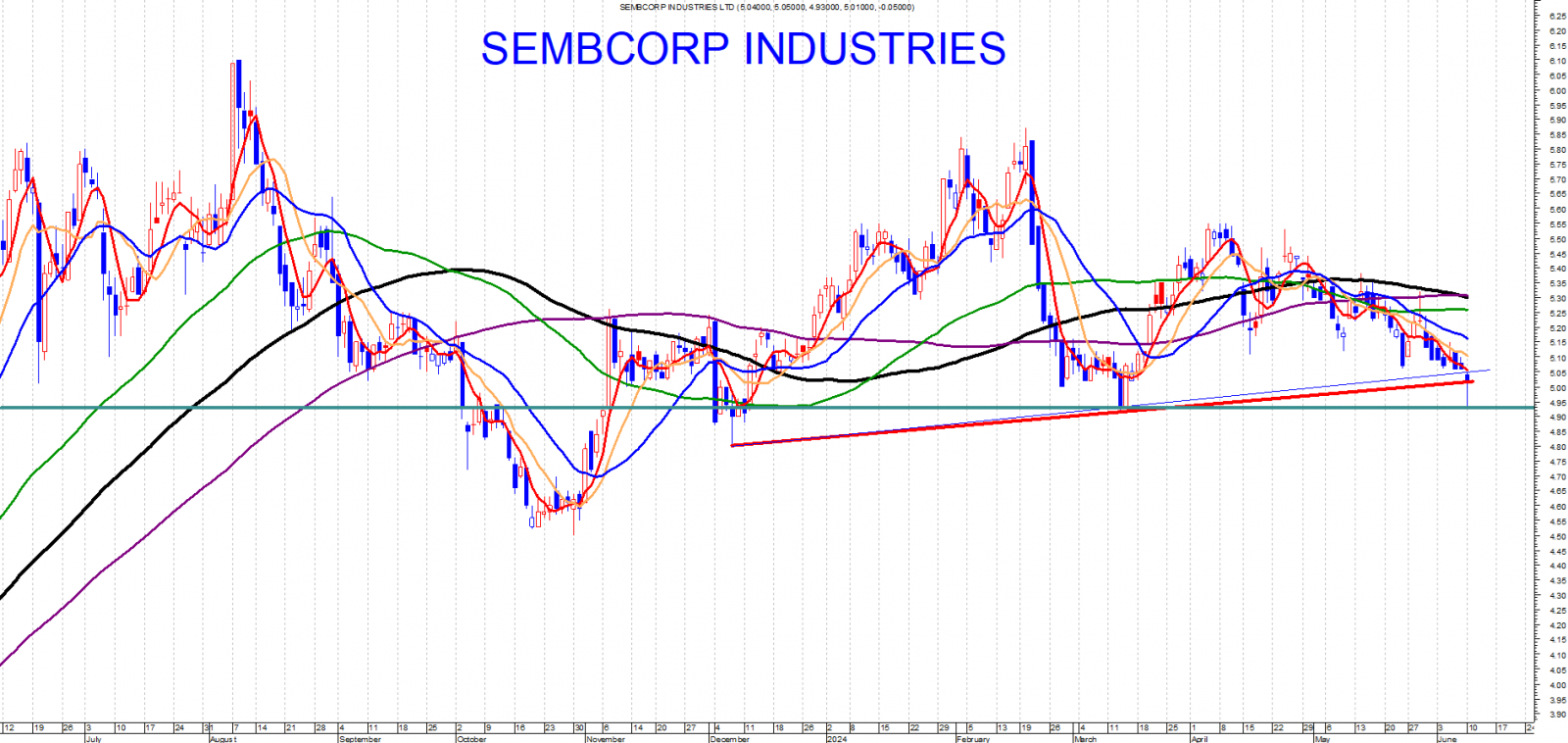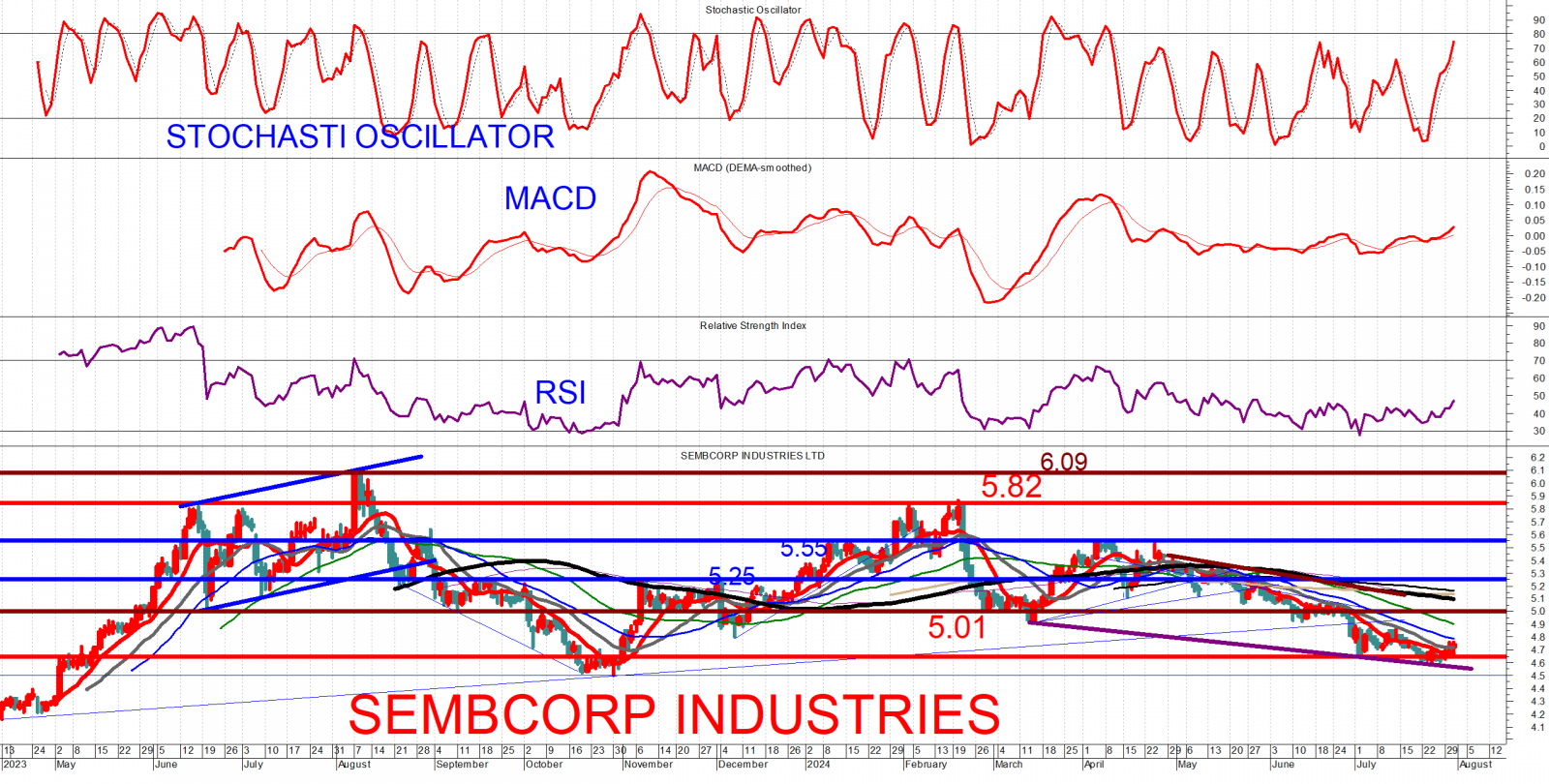 以下是辉立证券首席股票经纪陈奕利先生的股市分析: 胜科工业(SEMBCORP INDUSTRIES)经过漫长的调整后在触及长期的支持线后开始上涨,STOCHASTIC OSCILLATOR、MACD和RSI都在好转中,可开始注意。" (所提供的本文只供参考, 投资买卖,必须審慎,自负责任。版权所有,未经允许,禁止转载。) ![]() ( All contents provided are for informational purposes only. Access to and the use of the contents are at the user's own risk. You should assess your situation and risk tolerance, and do your own due diligence before making any investment decisions. All losses and costs associated with investing are your responsibility. All rights reserved. This material may not be published, broadcast, or redistributed without permission.) The following is the market analysis by Phillip Securities Principal Remisier Mr Willie Tan Yi Li: " After a long pullback, SEMBCORP INDUSTRIES began to rise after touching the long-term support line. STOCHASTI OSCILLATOR, MACD and RSI are all improving, so we may start to watch out for this stock."
