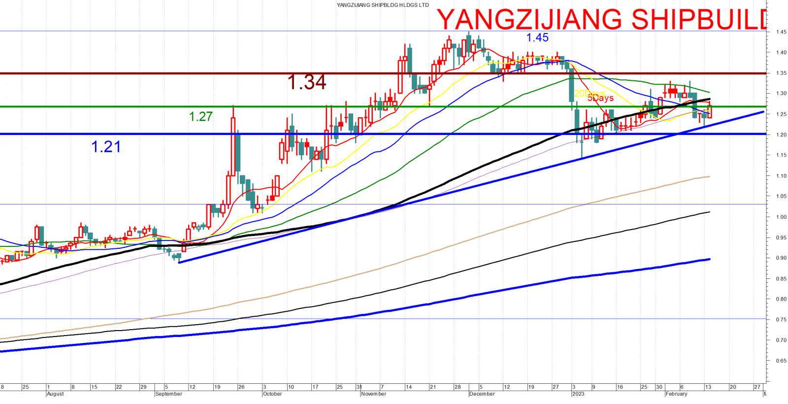 "YANGZIJIANG SHIPBUILDING 扬子江船厂经过两周的调整,又触及长期的支持线。如不跌破这条支持线,就可能挑战1.45,现价:1.27 支持1.24"