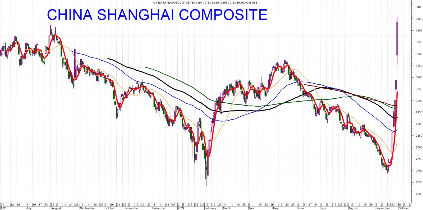 以下是辉立证券首席股票经纪陈奕利先生的股市分析: "中国央行星期天又出新招,首套、二套房存量房贷利率批量下调, 平均降幅0.5%左右。中国一招接一招,看来不止要提振股市上涨,也可能要保住5%经济增长的设限。周一中国所有的股指都暴涨,气势如虹。中国总理李强星期天要求救市政策相对成熟即马上推出,也几乎是救市政策将会不断的出招,这一次可能是来真的。短短4天,上证指数已大涨605点。顺便给大家看看令人咂舌的上证综指惊人的走势。(图表请参看ECOMM网站)" (所提供的本文只供参考, 投资买卖,必须審慎,自负责任。版权所有,未经允许,禁止转载。) ( All contents provided are for informational purposes only. Access to and the use of the contents are at the user's own risk. You should assess your situation and risk tolerance, and do your own due diligence before making any investment decisions. All losses and costs associated with investing are your responsibility. All rights reserved. This material may not be published, broadcast, or redistributed without permission.) The following is the market analysis by Phillip Securities Principal Remisier Mr Willie Tan Yi Li: "The People's Bank of China made a new move on Sunday, lowering the interest rates of existing mortgage loans for the first and second sets of houses in batches by an average of about 0.5%. China has taken one strategic move after another. It seems that it not only wants to boost its stock market, but also to maintain the 5% economic target growth. All Chinese stock indices soared on Monday with great momentum. Chinese Premier Li Qiang requested on Sunday to launch out market-rescuing measures as soon as they are ready to be launched at the right timing, which means that market-rescuing policies will continue to be launched, and it looks like this time they mean it for real. In just 4 days, the Shanghai Composite Index has risen by 605 points. Let us take a look at the amazing market trend of the Shanghai Composite Index. (Please refer to the chart on ECOMM website)" ![]()