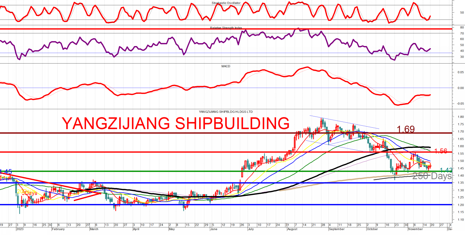 "YANGZIJIANG SHIPBUILDING fell from 1.56 to 1.43 and began to rebound. The current price is 1.47. With the support of the 250-day line, it may test 1.56 and 1.69. Support is at 1.43. (See the chart at ECOMM website)."