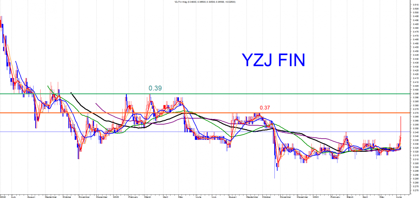* 扬子江金融 (YZJ Fin) 收涨 1.9%,至 53 分。这只股在我们 2024年6月11日的技术图表分析中有再次被提及。近两年来,该股价大致上都在 40 分以下交易,而今年终于冒出头来,出现上升的趋向。 * 恒生指数周五飙升 3.69%, 或 805.96 点,科技股继续领涨。腾讯上涨 7.42%,至 474.80 港元。我们在 2025年2月6日早上9点讯息中提到的比亚迪再飙升 7.43%,至 364.20 港元。 * 阿里巴巴周五上涨 6.34%,至 124.10 港元。我们在 2025年1月20日的技术图表分析中有再次推荐阿里巴巴,当时其交易价为 85.38 港元;此后,其股价如烈马奔腾,从那时到目前为止,已飙升了超过 45% 。 所提供的本文只供参考, 投资买卖,必须審慎,自负责任。版权所有,未经允许,禁止转载。) ( All contents provided are for informational purposes only. Access to and the use of the contents are at the user's own risk. You should assess your situation and risk tolerance, and do your own due diligence before making any investment decisions. All losses and costs associated with investing are your responsibility. All rights reserved. This material may not be published, broadcast, or redistributed without permission. ) * Yangzijiang Finance (YZJ Fin) closed up 1.9% to 53 cents. This stock was mentioned again in our technical chart analysis on 11 June 2024. It had been largely trading below 40 cents for almost 2 years, and finally had an impressive run this year. * The Hang Seng Index surged 3.69% or 805.96 points as tech stocks continued to lead gains. Tencent jumped 7.42% to HK$ 474.80. BYD, which was mentioned in our 6 Feb 2025 9.00am update, soared another 7.43% to HK$364.20. * Alibaba rose 6.34% to HK$124.10. The technical chart analysis of Alibaba was done in our 20-Jan-2025 market update when its stock price was trading at HK$85.38; Alibaba's stock price had since galloped 45% to the current price like a raging stallion.
