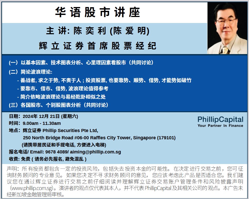 陈奕利(陈爱明)先生成功举办2024年12月21日的华语股市讲座。感谢大家在佳节期间抽空下来参加讲座。 The Mandarin Stock Market Seminar by Mr Tan Yi Li @ Tan Ai Ming was successfully concluded on 21 Dec 2024. Our heartfelt thanks to everyone who came down to the seminar during the festive period.